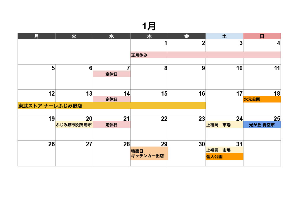 1月のイベント出店スケジュール 2026年01月11日 イベント情報 2026年1月のイベント出店スケジュールのお知らせです。お買い求めいただきやすい商品をご用意しておりますのでお近くのお客様はぜひお立ち寄りください。 ◆1月29日(木)は特売日 店先に当店のキッチンカーが出店します。